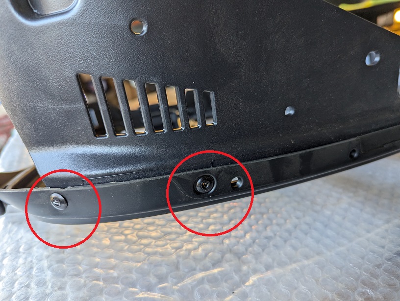 ナンバー灯を覆うリヤウイングを外しますがボルトと両面テープで強力に