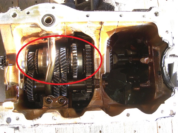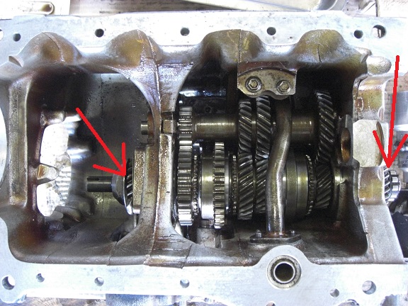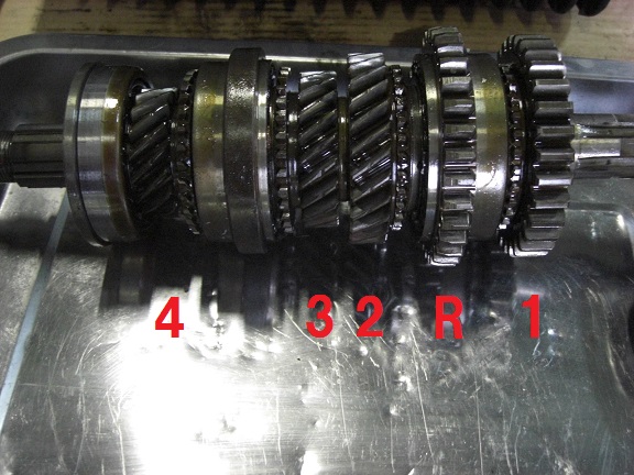 右のインプットを回すとカウンターギヤとメインシャフト上のメインギヤは