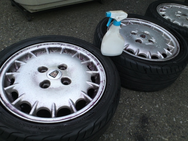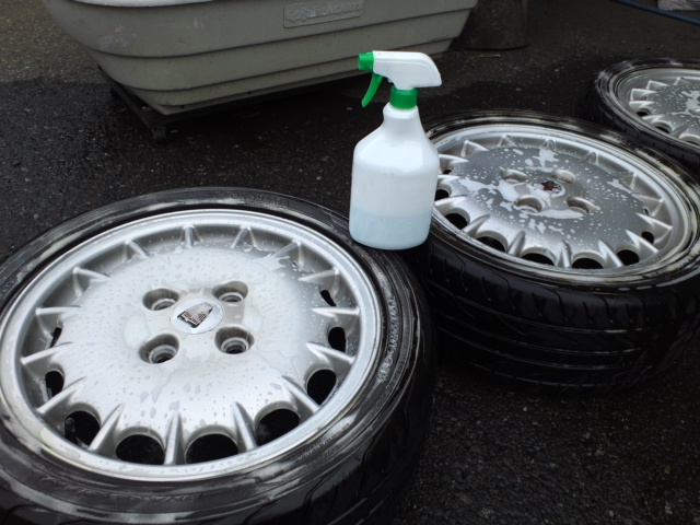 次に工業用油分分解洗浄剤をスプレーして、ホイールやタイヤの油分を