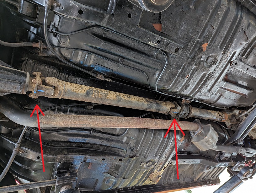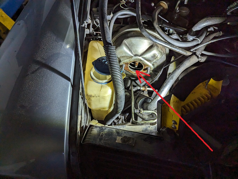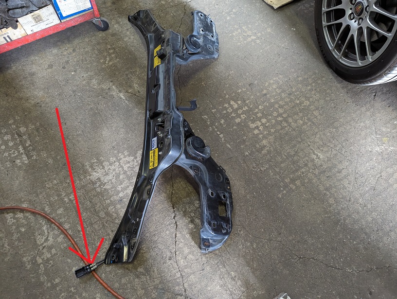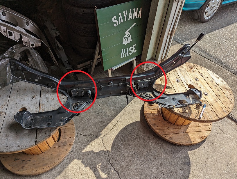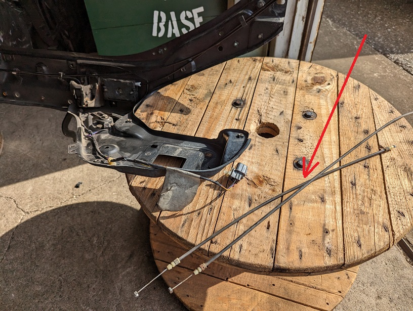 ちょうど印の辺りに左右のボンネットキャッチと室内と接続する3本のワイヤーが