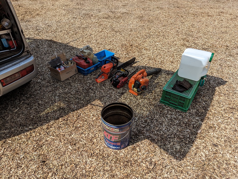 月曜日はとても風が強かったので大小のチェーンソーを用意