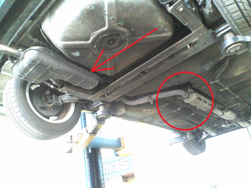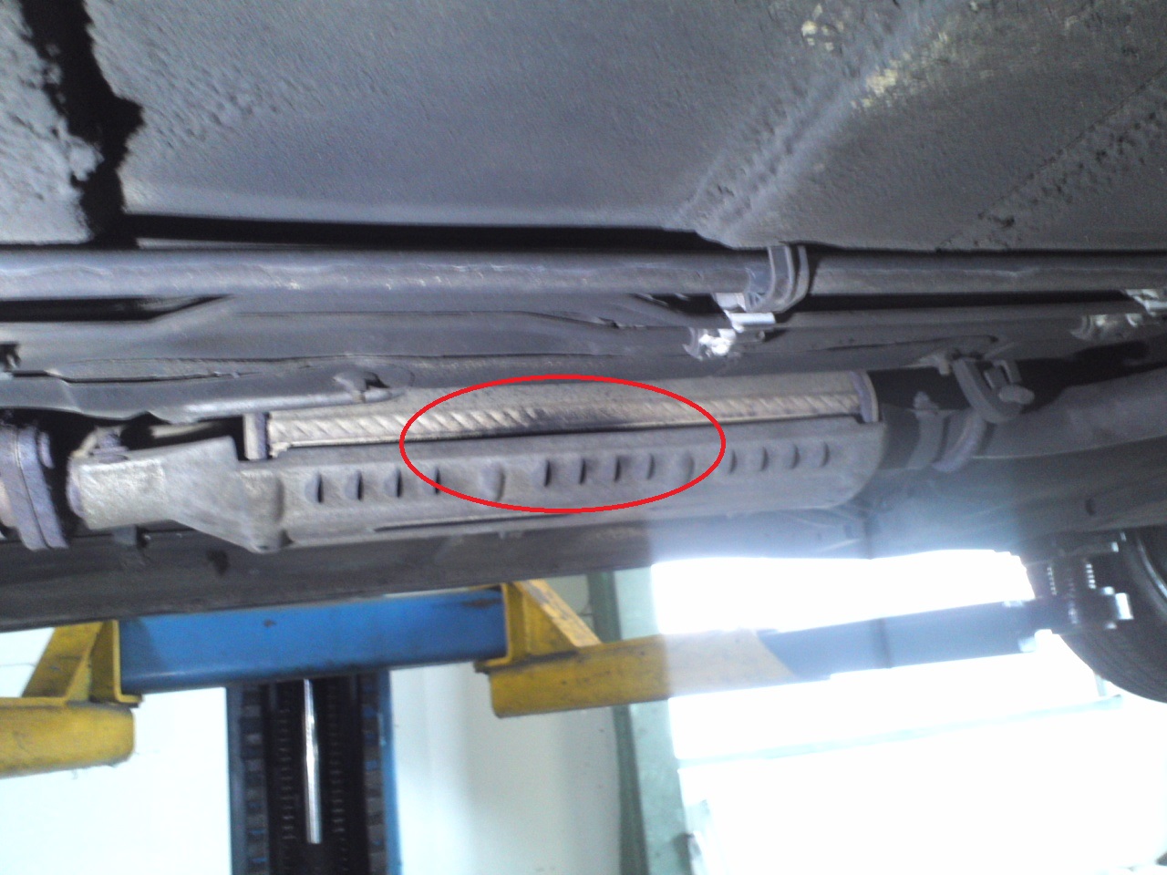 触媒後ろの中間マフラーの遮熱板上部が煤けています。