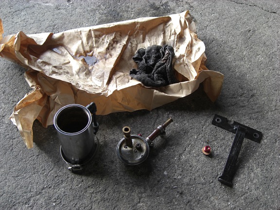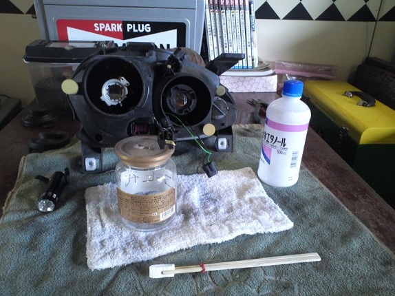バルブ側から割り箸にコットンを挿みエタノールでレンズ内側の曇りをふき取ります